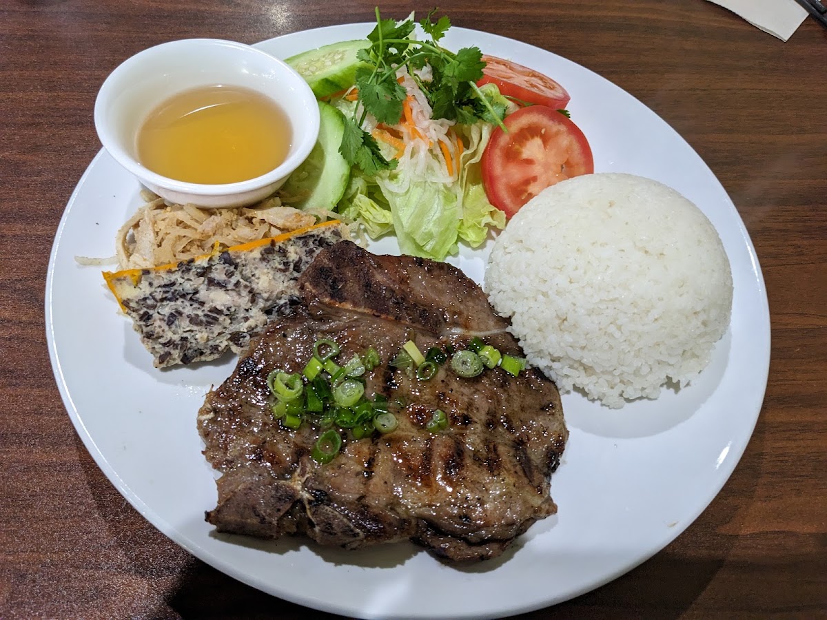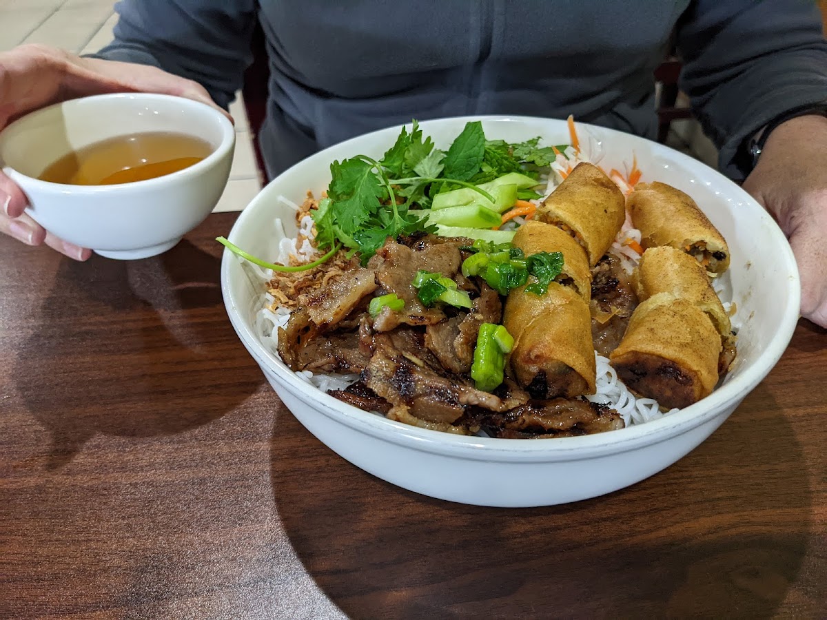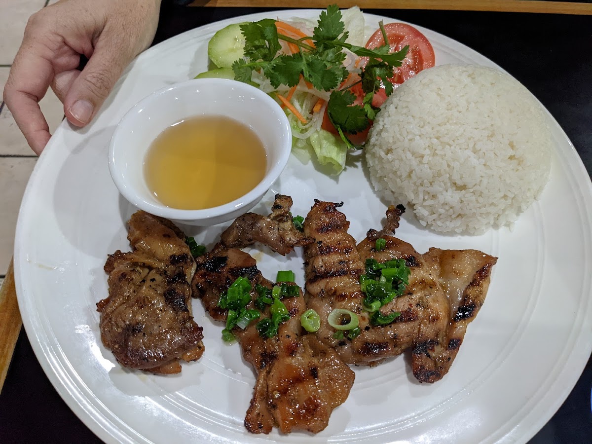 Food is good and well marinated. They don’t have the combo like the other pho place for rice plate like with grill or egg so in that case it’s on the pricey side. Eggroll is good too. Will try the soup next time