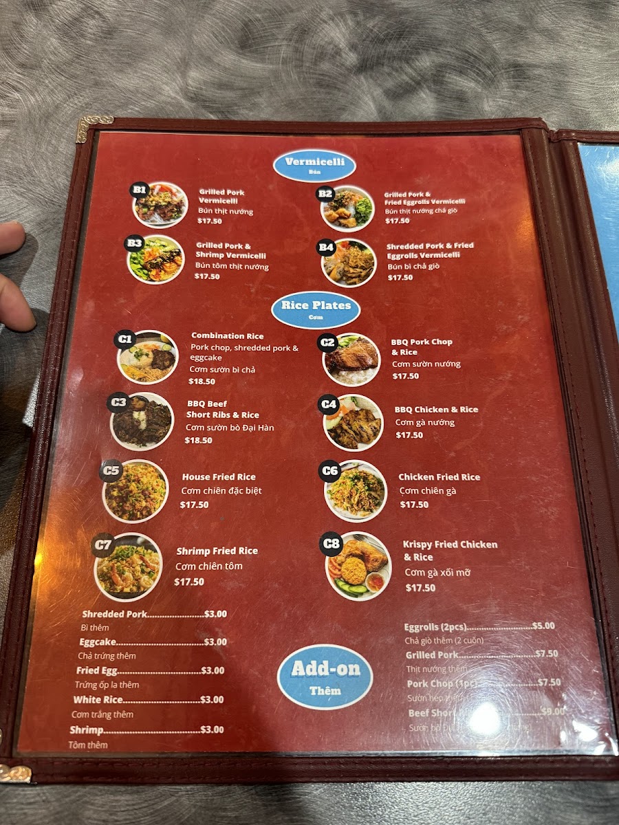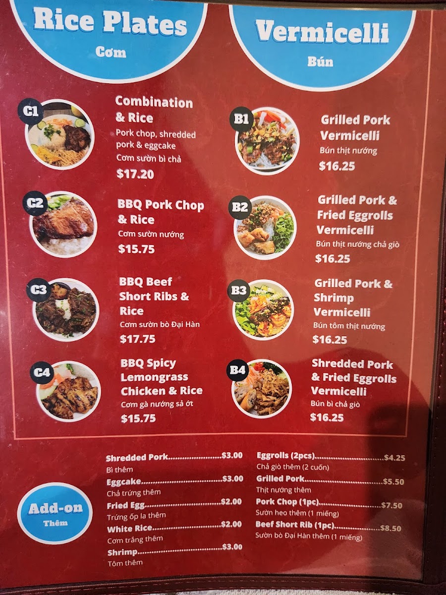 You’ll find classic bowls of pho featuring tender cuts of beef, seafood options, and well-made vegetarian choices, all simmered in rich, aromatic broths. Alongside the pho, the menu includes heartier rice plates and vermicelli bowls, such as BBQ lemongrass chicken, grilled pork with egg rolls, and shrimp, presenting a satisfying blend of textures and flavors.